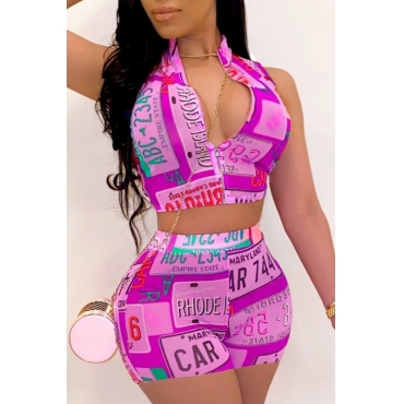 Lovely Sexy Letter Print Purple Two-piece Shorts Set