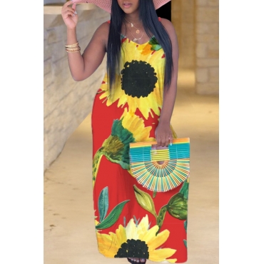 Lovely Bohemian V Neck Sunflower Print Red Maxi Dress