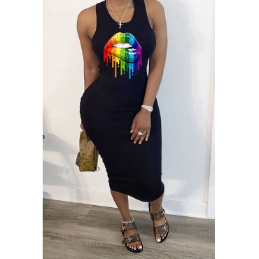 Lovely Leisure Lip Print Black Mid Calf Dress