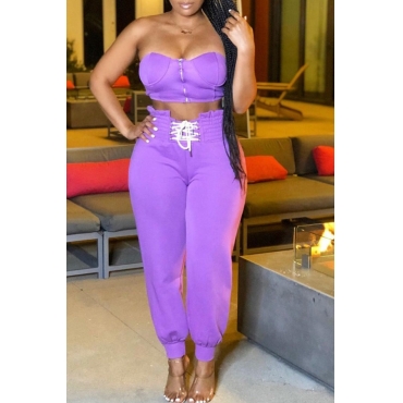 Lovely Trendy Dew Shoulder Bandage Design Purple Two-piece Pants Set