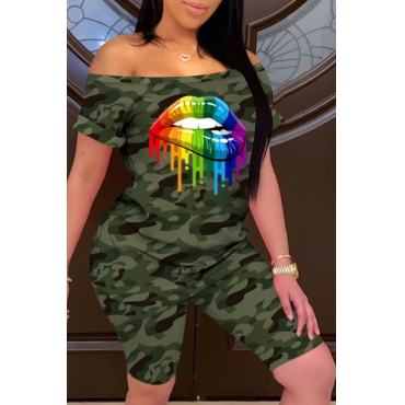 Lovely Casual Lip Print Green Two-piece Shorts Set