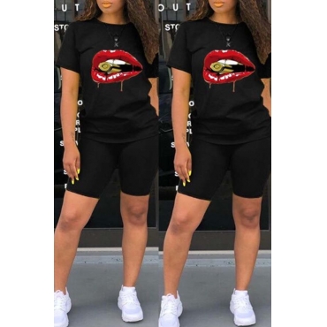 Lovely Leisure Lip Print Black Two-piece Shorts Set