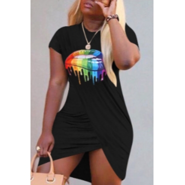 Lovely Leisure O Neck Lip Print Black Mini Dress