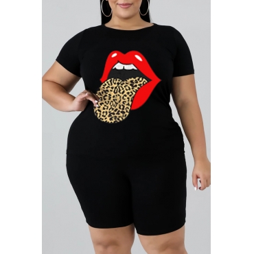 Lovely Casual Lip Print Black Plus Size Two-piece Shorts Set