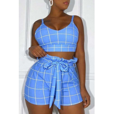 Lovely Casual Grid Blue Two-piece Shorts Set