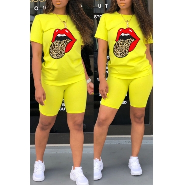Lovely Casual Lip Print Yellow Two-piece Shorts Set