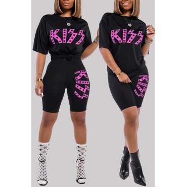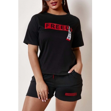 Lovely Sportswear Letter Print Black Two-piece Shorts Set