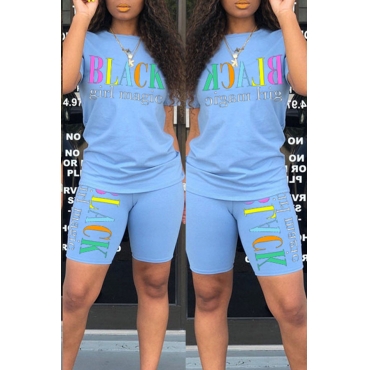 Lovely Leisure Letter Print Baby Blue Two-piece Shorts Set