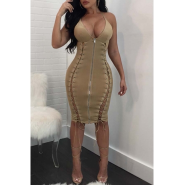 Lovely Sexy Drawstring Khaki Knee Length Dress