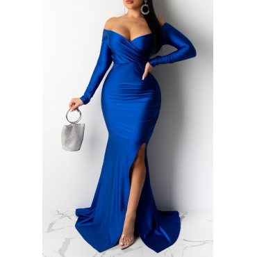Lovely Party V Neck Side Slit Blue Trailing Prom Dress