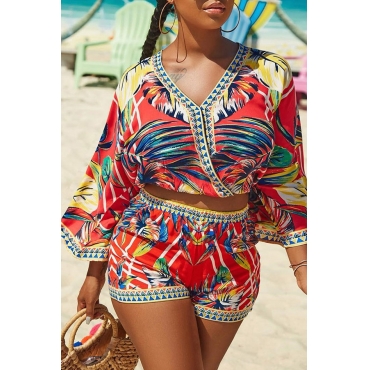Lovely Chic V Neck Print Red Two-piece Shorts Set