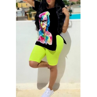 Lovely Casual O Neck Printed Black Two-piece Shorts Set
