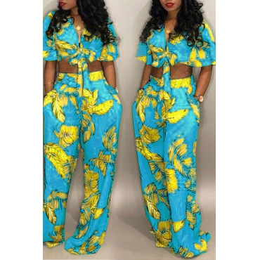 Lovely Chic Floral Print Baby Blue Two-piece Pants Set