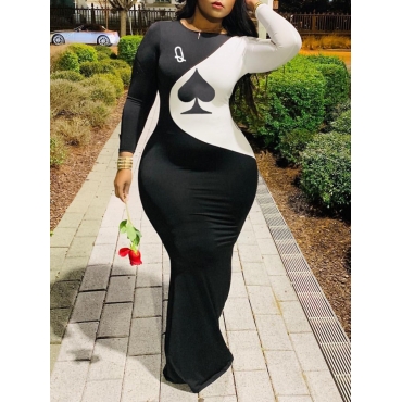 Lovely Casual O Neck Print Patchwork Black Maxi Plus Size Dress