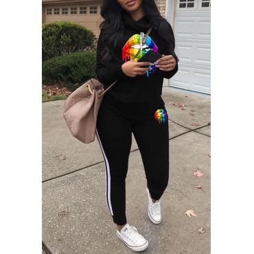 Lovely Casual Lip Printed Black Two-piece Pants Set