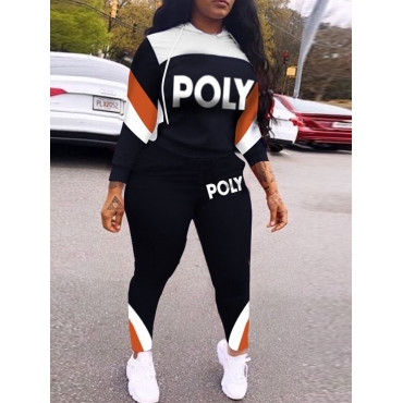 Lovely Sportswear Hooded Collar Print Patchwork Black Two Piece Pants Set