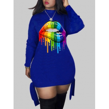 Lovely Street O Neck Lip Print Blue Mini Plus Size Dress