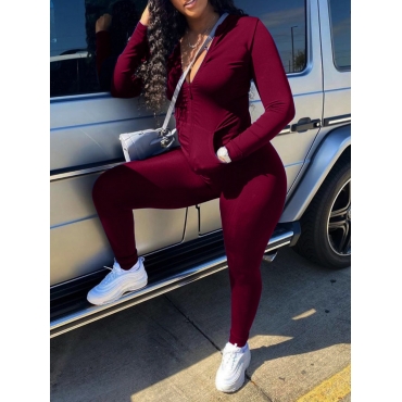 Lovely Casual Turndown Collar Zipper Design Wine Red Two Piece Pants Set