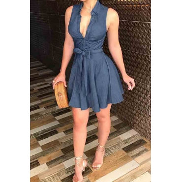 Lovely Casual Turndown Collar Ruffle Design Blue Mini Dress
