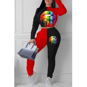 Lovely Casual O Neck Lip Printed Red Two-piece Pants Set