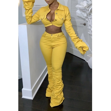 Lovely Casual Ruffle Design Yellow Two-piece Pants Set
