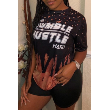 Lovely Casual O Neck Letter Printed Black Two-piece Shorts Set
