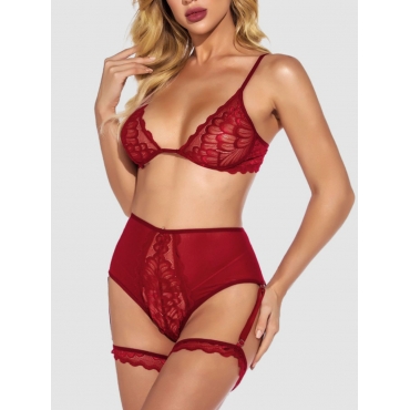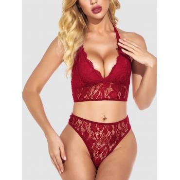 Lovely Sexy High-waisted See-through Wine Red Bra Set