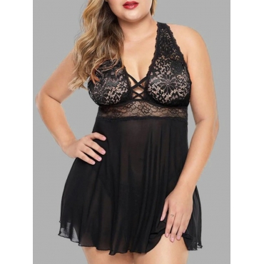 Lovely Sexy Mesh Bandage Hollow-out Design Black Plus Size Babydoll
