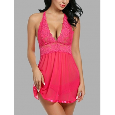 Lovely Sexy See-through Ruffle Design Split Rose Red Babydoll