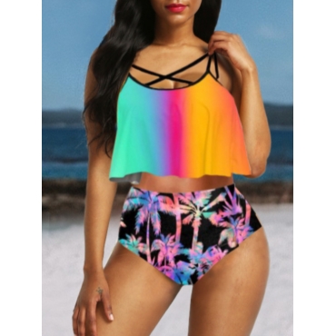 Lovely Trendy Gradient Print Bandage Hollow-out Design Multicolor Tankini