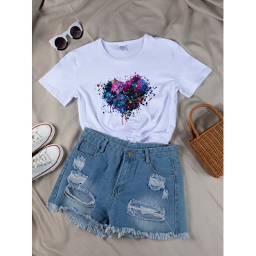 Lovely Casual O Neck Heart-shaped Splash Ink Print White T-shirt