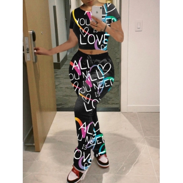 Lovely Casual O Neck Letter Heart-shaped Print Black Two Piece Pants Set