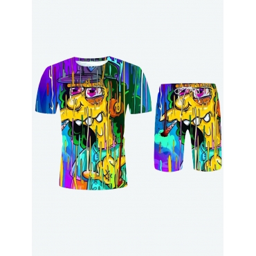 Lovely Casual O Neck Graffiti Print Multicolor Men Two Piece Shorts Set