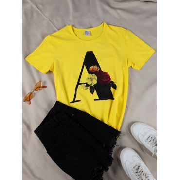 Lovely Casual Floral Letter Print Yellow T-shirt
