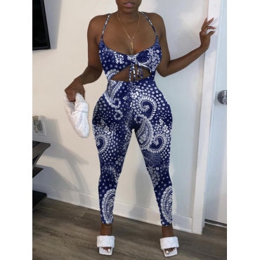 Lovely Sweet Floral Print Bandage Hollow-out Design Blue One-piece Jumpsuit(No-positioning Printing)