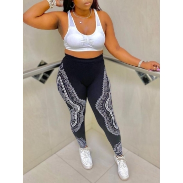 Lovely Sportswear U Neck Print Patchwork Black Two Piece Pants Set