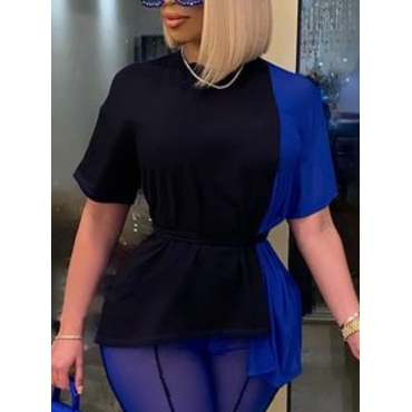 Lovely Casual O Neck Patchwork Blue T-shirt