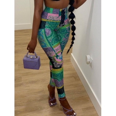 Lovely Ethnic High-waisted Print Patchwork Green Pants