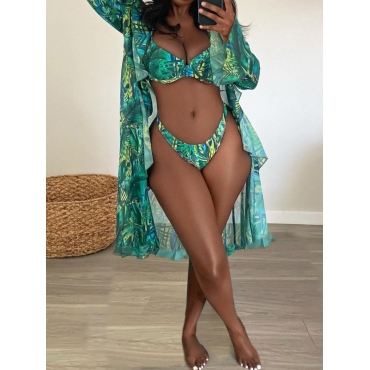 Lovely Sexy Print Patchwork Green Two-piece Swimsuit(With Cover-up)