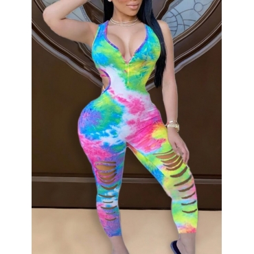 Lovely Casual Tie-dye Backless Broken Holes Multicolor Plus Size One-piece Jumpsuit