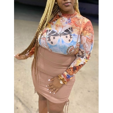 Lovely Street Butterfly Print Drawstring Pink Mini Plus Size Dress