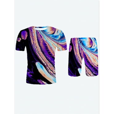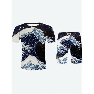 Lovely Casual O Neck Waves Print Multicolor Men Two Piece Shorts Set