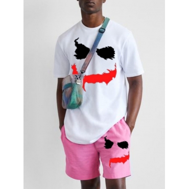 Lovely Casual O Neck Graffiti Print White Men Two Piece Shorts Set