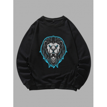 Lovely Casual O Neck Lion Print Black Men Hoodie