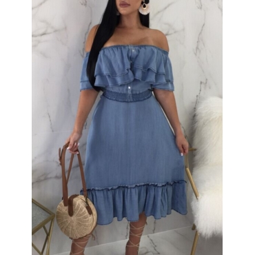 Lovely Sweet Off The Shoulder Flounce Design Baby Blue Mid Calf Denim Dress