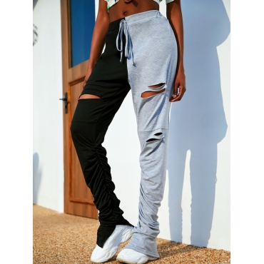 Lovely Sporty Patchwork Broken Holes Black Pants