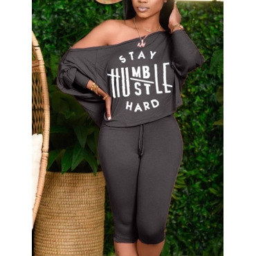 Lovely Casual Letter Print Drawstring Loose Black Two Piece Shorts Set