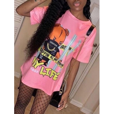 Lovely Street O Neck Cartoon Letter Print Pink Mini Dress
