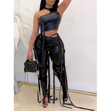 Lovely Chic Tassel Design Asymmetrical Black Two Piece Pants Set