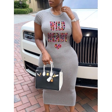 Lovely Casual Leopard Letter Print Grey Mid Calf Dress